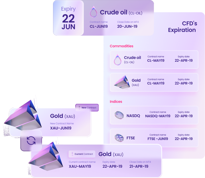 A continuación se muestran las fechas de vencimiento de los CFD vinculadas a activos específicos. Debe elegir entre cerrar las posiciones abiertas, dejar que caduquen o renovarlas. Si se renueva, cualquier orden pendiente existente (Stop Loss, Take Profit, Entry Stop o Entry Limit) se ajustará simétricamente (punto por punto) para reflejar la diferencia de precio entre los contratos que vencen y los nuevos.